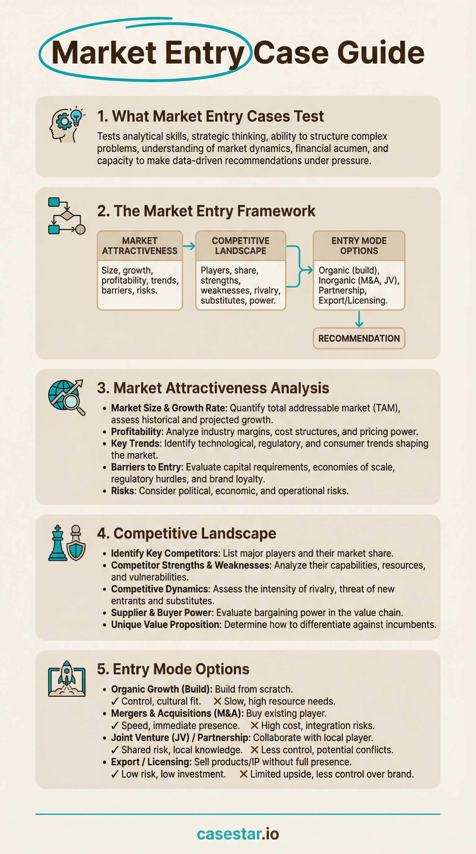 Summary: Market entry cases ask whether a company should enter a new market and how. Structure your analysis around four questions: Is the market attractive? Can we compete? Do we have the capabilities? How should we enter? The answer is usually "it depends" - your job is to identify what it depends on and make a recommendation based on the specific situation.