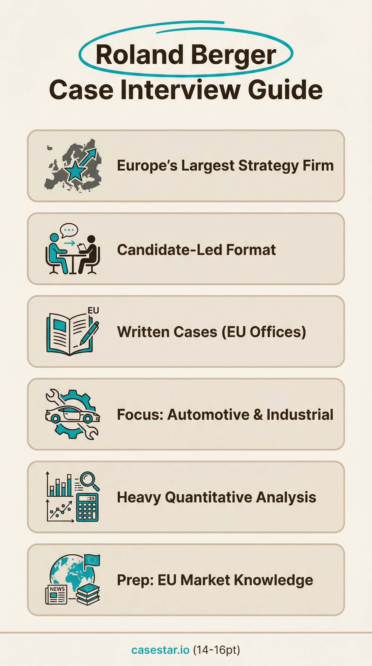 Summary: Roland Berger is Europe's largest strategy consulting firm, headquartered in Munich. Interviews use a candidate-led case format with strong emphasis on quantitative analysis. Expect 2-3 rounds with 2-3 interviews each, potentially including written case studies. Cases often feature European markets, automotive clients, and industrial operations. The firm values analytical rigor, entrepreneurial thinking, and practical problem-solving skills.